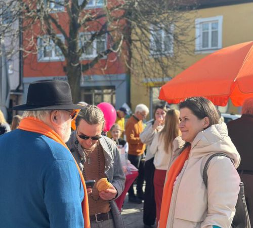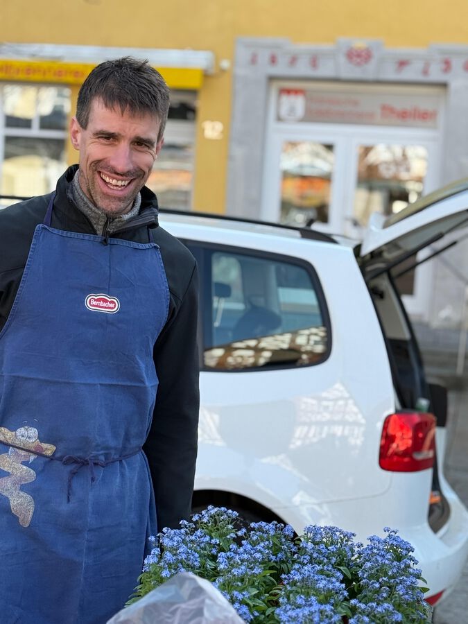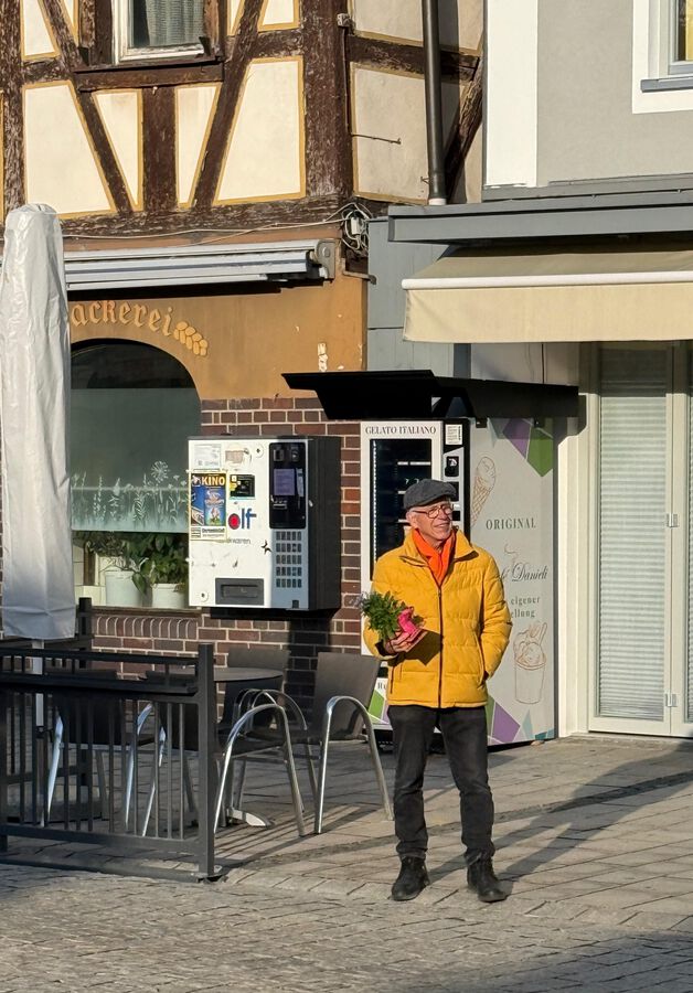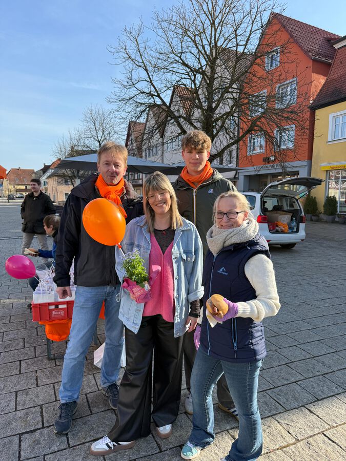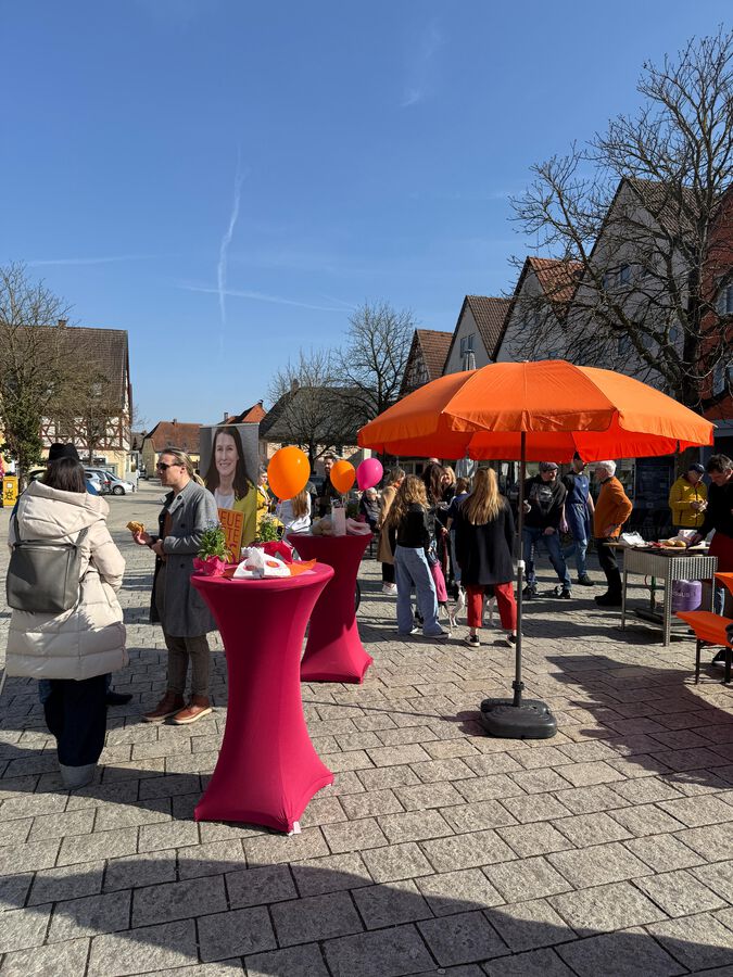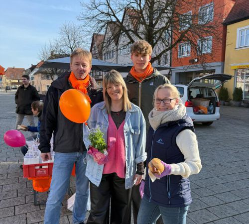 Viele Gespräche mit Marktplatzpassanten, Wahl-Info und Vergissmeinnicht für alle, die vorbeikamen oder im Auto entlangfuhren. Zurück kam viel Ermutigung, kamen viele anerkennende Worte. Später gab es noch leckere Bratwürste getreu dem spaßhaft-ernsten Wahlmotto „Es geht um die Wurst“.