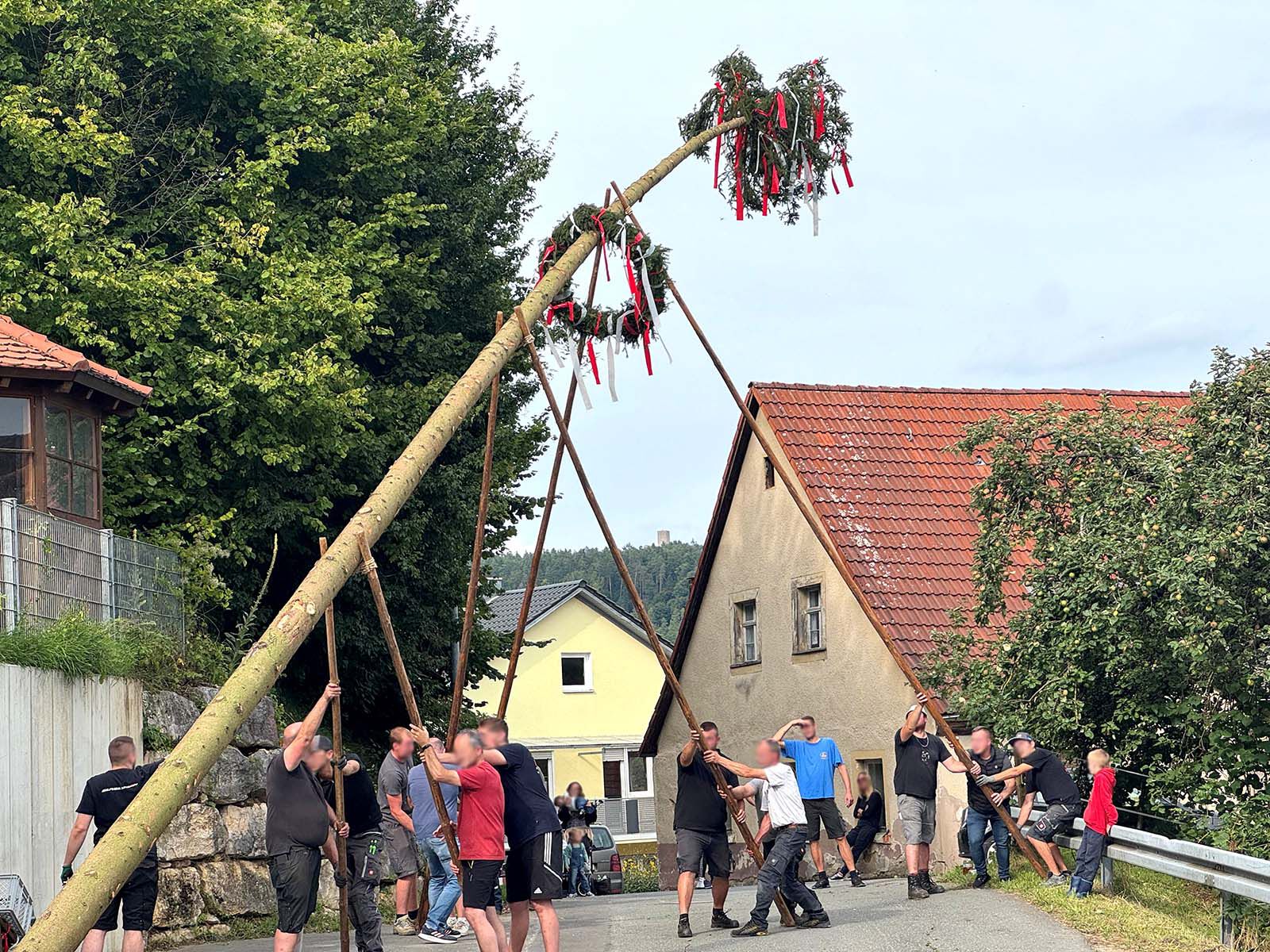 Vom 2. bis 5. August 2025 verwandelte sich Neuses-Poxstall wieder in einen Ort der Geselligkeit – die Kerwa wurde gefeiert! Ein besonderer Höhepunkt war das Aufstellen des Kerwa-Baums – eine Tradition, die echtes Teamwork verlangt. Mit kräftigen Händen und viel Geschick wurde der Baum von den engagierten Helfern aufgerichtet.