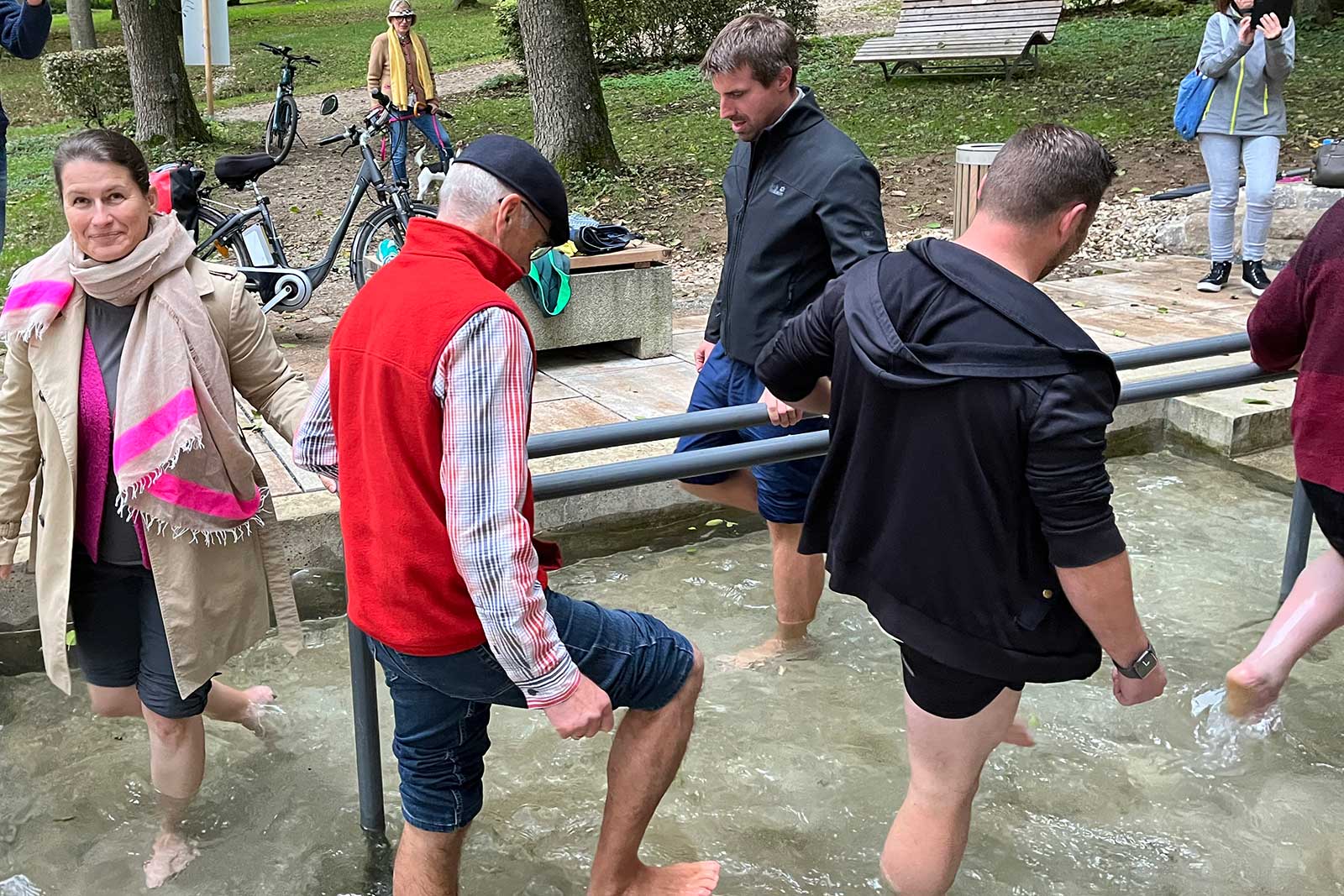 Die Arbeiten waren durch ein Förderprogramm des Freistaats zum Kneipp-Jahr 2021 möglich geworden, durch das 50 % der Kosten von etwas über 18.000 € übernommen wurden, sagte Meyer, die insbesondere den Bauhofmitarbeitern und dem Kämmerer für ihren Einsatz dankte. Auch von der kühlen Witterung ließ sie sich nicht abhalten, zusammen mit weiteren Unerschrockenen das Schreitbecken gleich auszuprobieren. Es ist nicht zuletzt auch der stetigen Aufmerksamkeit von NLE-Stadtrat Bernhard Hübschmann zu verdanken, dass der Stadtpark insgesamt ein sehr erfreuliches und einladendes Bild bietet – für Einheimische und Gäste.